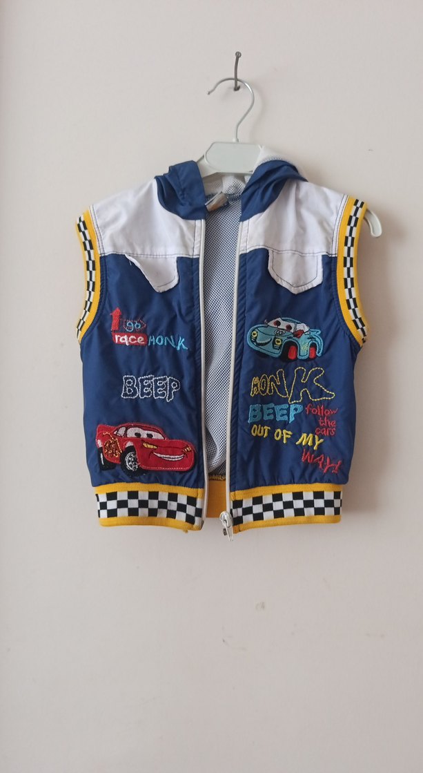 Erkek çocuklar için kolsuz, renkli baskılı, kapüşonlu ve fermuarlı yelek. Sentetik kumaştan, dar kesim ve straplez yakalıdır.