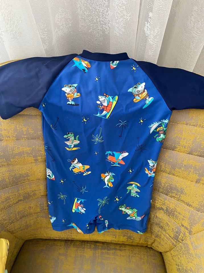 Erkek çocuk kısa kollu mayo, renkli mavi baskılı, eğlenceli karakterler ve palmiye ağaçları desenli. Canlı tasarımıyla yüzme keyfini artırır.
