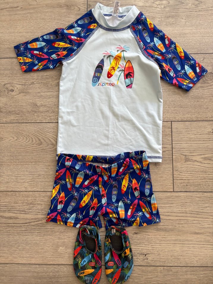 Erkek çocuklar için kısa kollu mayo üstü ve uyumlu renkli baskılı şorttan oluşan set. Canlı desenler plajda eğlenceli bir görünüm sağlar. Alt-üst 4-5 patik 24-26