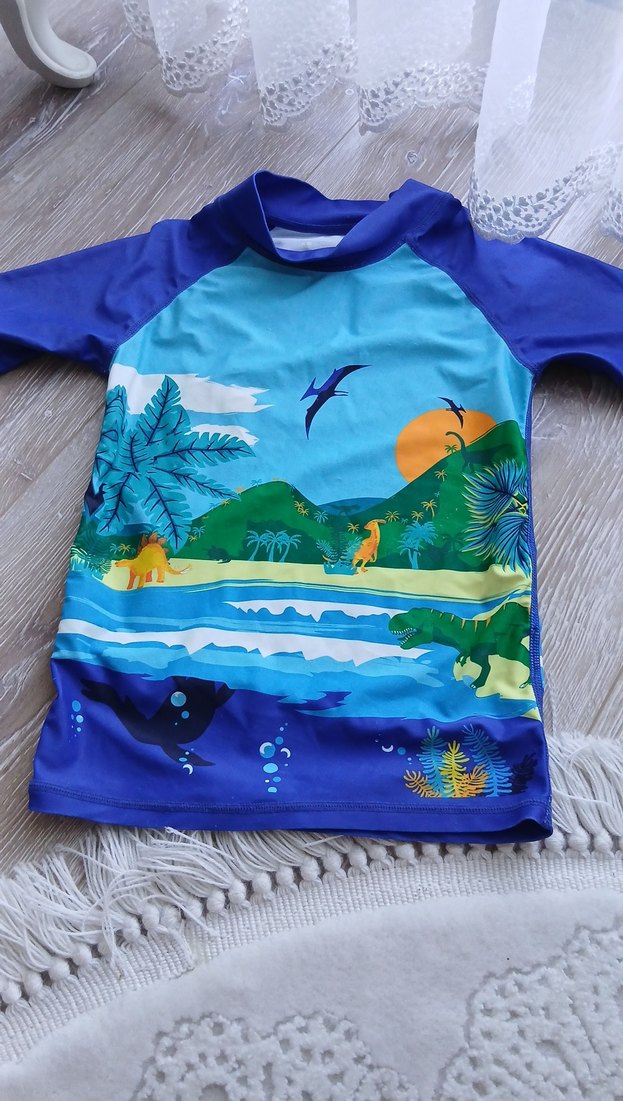 Erkek çocuk için kısa kollu, renkli baskılı ve doğa ile dinozor temalı mayo üstü. Canlı mavi tonlarda, rahat kullanım sağlar.