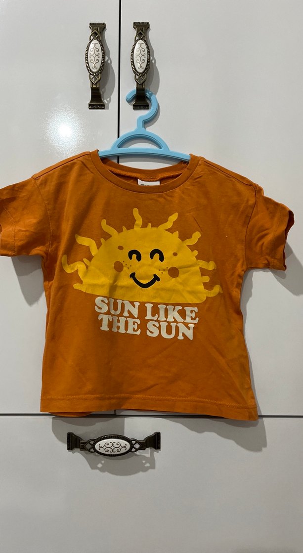 Erkek çocuk için renkli baskılı, kahverengi, kısa kollu ve yuvarlak yakalı bol kesim tişört. Üzerinde gülen güneş ve "SUN LIKE THE SUN" yazısı bulunur. ☀️