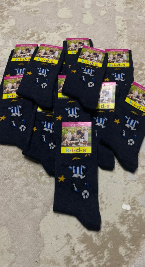 Erkek çocuklar için renkli futbol temalı baskılı mavi çoraplar. Ambalajda 'k.i-d-s' markası yer alıyor. ⚽topdan alınırsa 10 tl tanesi