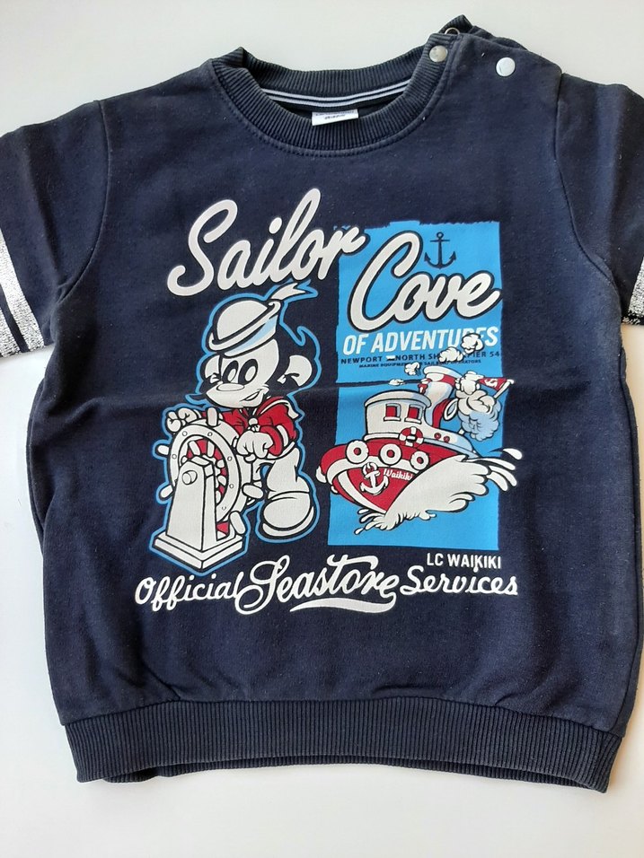 Mavi renkli, kısa kollu, yuvarlak yaka, pamuklu erkek çocuk sweatshirtü, renkli denizci baskısına ve omuzda cırt cırtlı kapamaya sahiptir. Rahat geniş kesimlidir. ⚓