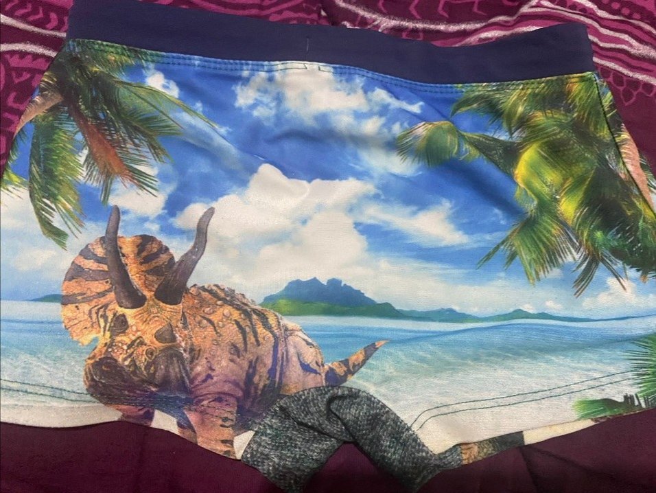 Erkek çocuk mayo, canlı renklerde dinozor ve plaj temalı baskıya sahiptir.