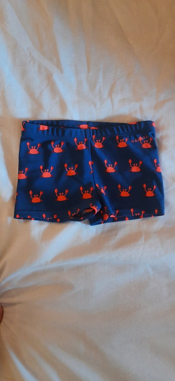 Mavi zemin üzerinde kırmızı yengeç baskılı, renkli erkek çocuk mayo şortu.