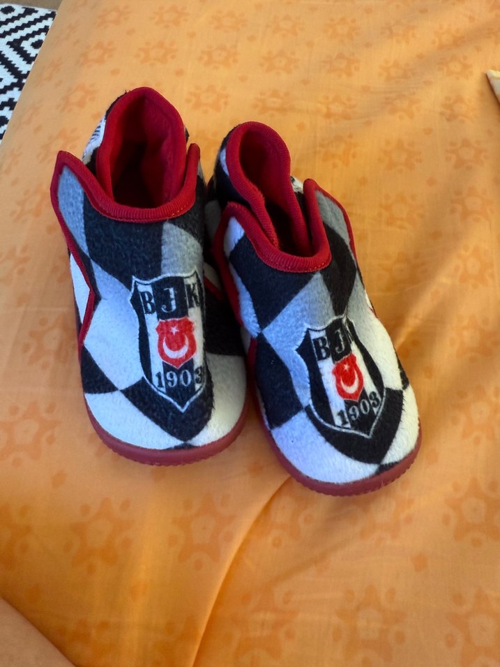 Erkek çocuklar için renkli baskılı, Velcro bantlı sıcak ve rahat ev terliği. Yumuşak kürk dokusundadır ve üzerinde "190" sayısı yer alır.