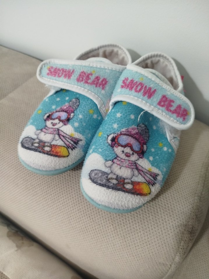 Erkek çocuklar için renkli baskılı, yumuşak ve sıcak tüylü kumaştan terlikler. "SNOWBEAR" yazılı cırt cırt bantlı, kolay kullanımlı. ❄️