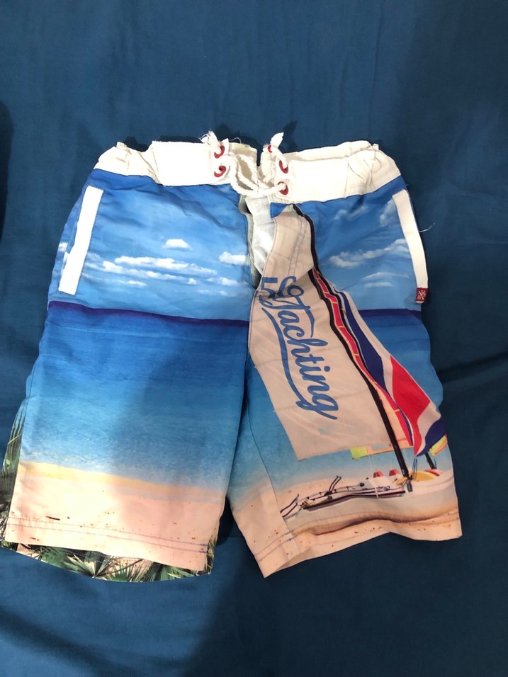 Renkli baskılı erkek çocuk şort mayo, yelken temalı ve bağcıklı bel detayına sahip. Üzerinde "Jachting" yazısı ve deniz manzarası bulunur.