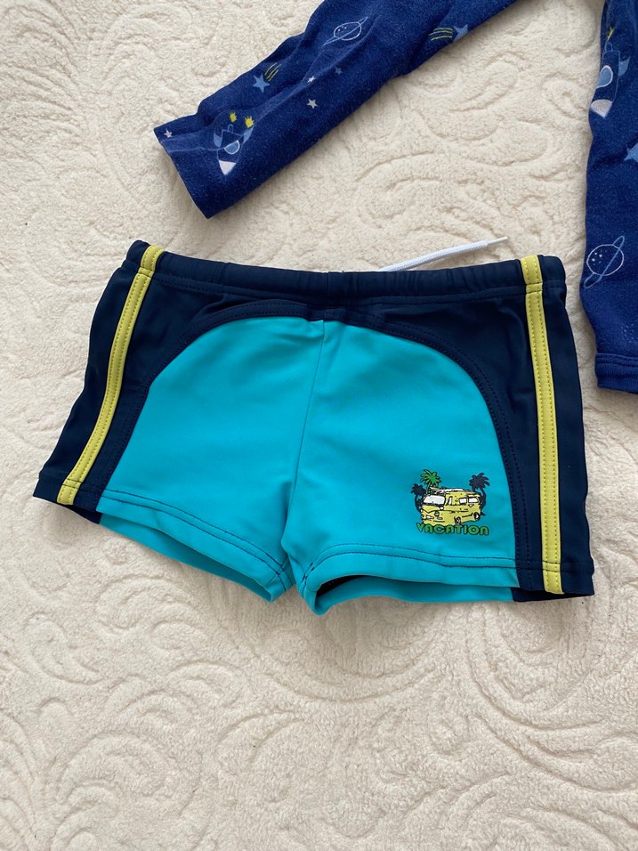 Erkek çocuk için renkli baskılı, kısa kollu ve mavi tonlarında şort mayo. Sarı çizgiler ve küçük tatil temalı baskı içerir.