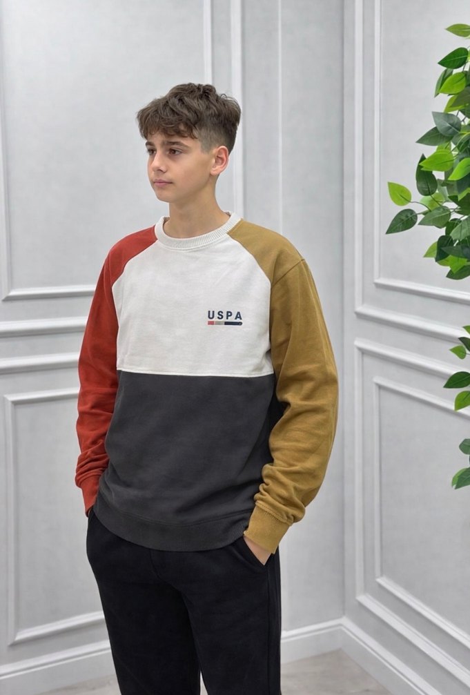 Erkek çocuklar için yuvarlak yakalı, uzun kollu ve bol kesim sweatshirt. Gri, kahverengi ve kiremit renk bloklu, göğüste USPA baskılı. Yumuşak ve sıcak kumaştan, rahat tarz için uygun.