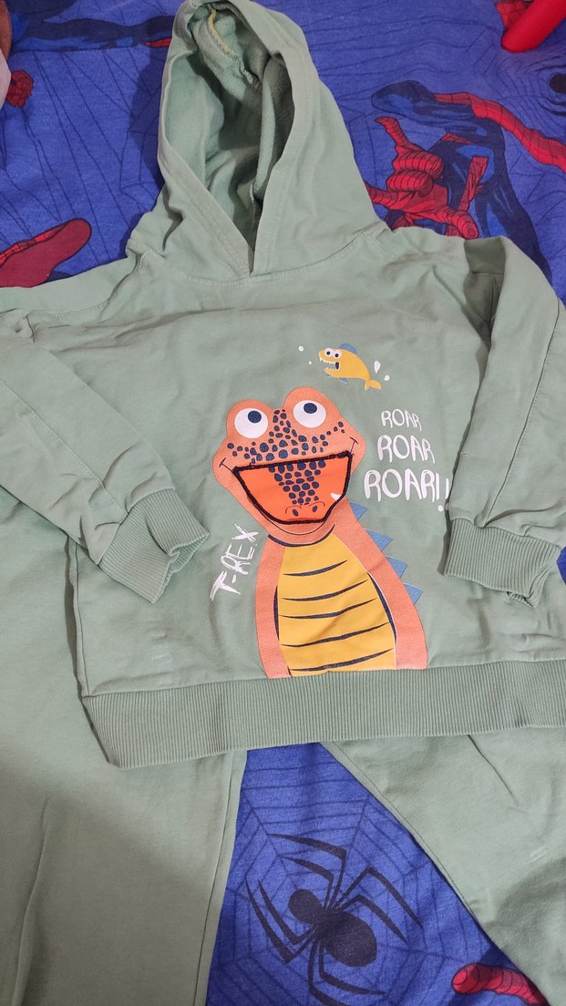 Erkek çocuk sweatshirt, renkli dinozor baskısı ve 'ROAR, ROARI' yazısı içerir. Kapüşonlu, uzun kollu ve yumuşak, sıcak kumaştan üretilmiştir.