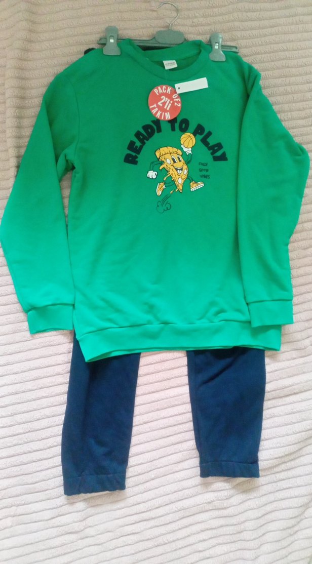 Erkek çocuk için bol kesim, bisiklet yaka, renkli baskılı yeşil sweatshirt ve lacivert eşofman pantolon. Sweatshirt yumuşak ve sıcak kumaşlı, pizza detaylıdır.