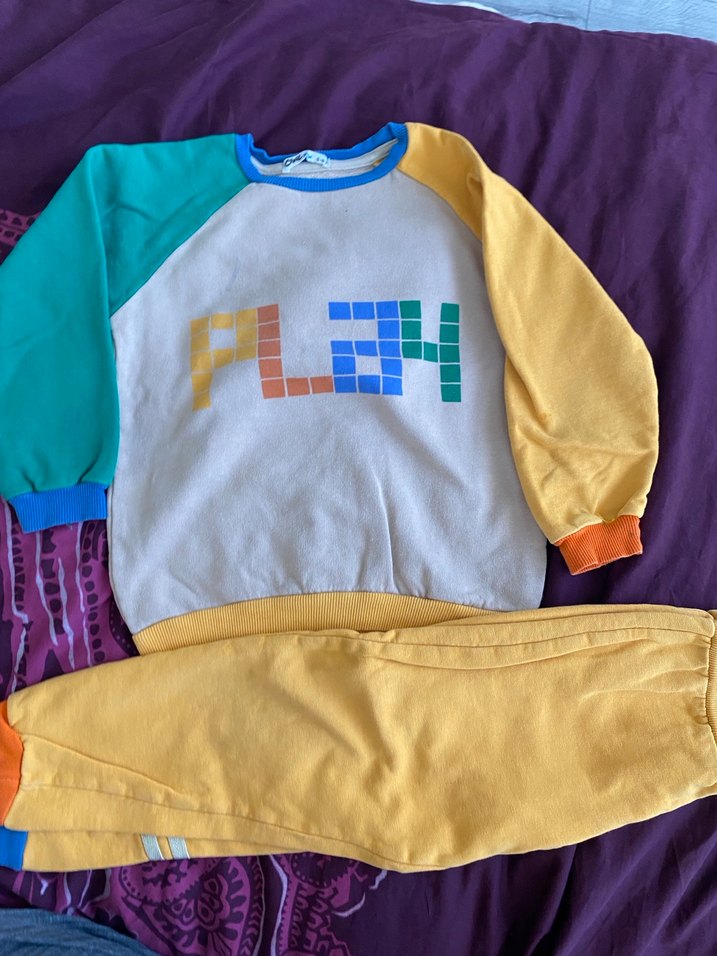 Civil marka 5-6 yaşErkek çocuklar için rahat kesim, çok renkli baskılı sweatshirt ve sarı eşofman. Yumuşak, sıcak kumaştan, bisiklet yaka ve sokak stiliyle. Üst tişörtte hafifi bir tahta kalemi lekesi mevcuttur fotoğrafta belirttim