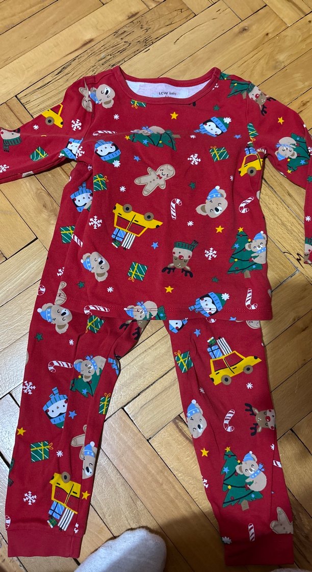 Erkek çocuklar için kırmızı zemin üzerine renkli tatil temalı baskılarla süslenmiş, uzun kollu, fitted kesim ve yuvarlak yakalı örme pijama takımı.