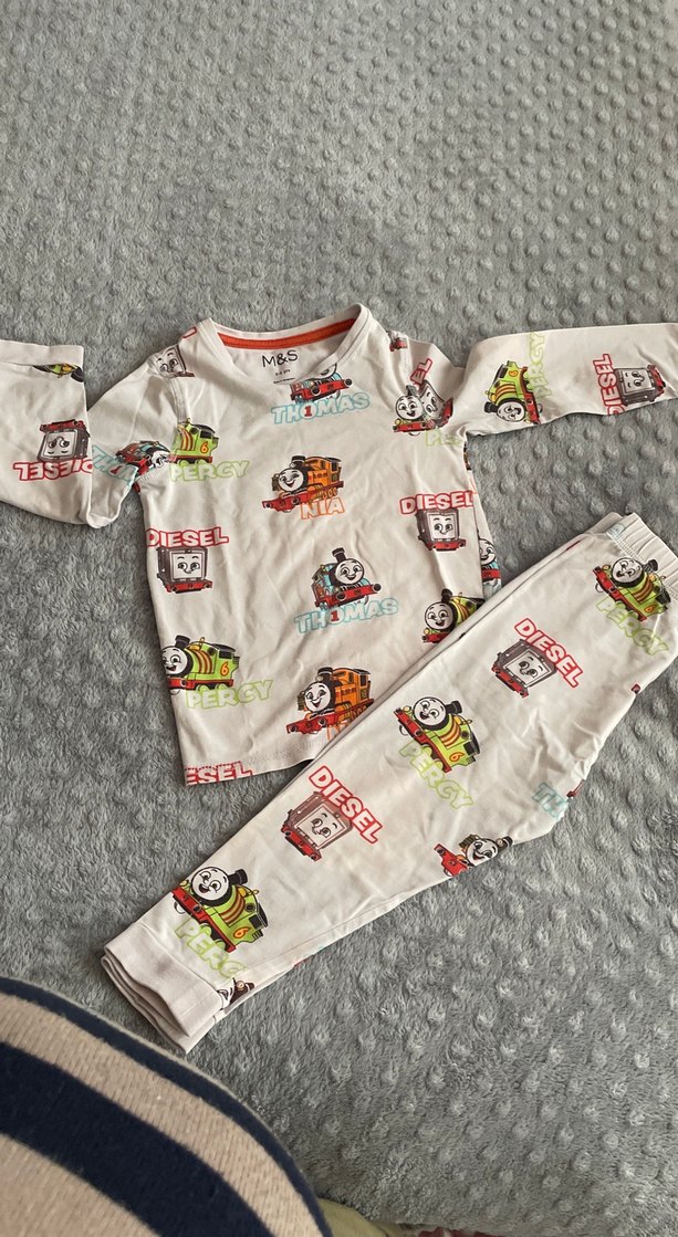 Erkek çocuklar için renkli baskılı, beyaz zeminli, uzun kollu, bisiklet yaka ve örme kumaştan yapılmış dar kesim pijama takımı. Sayılı kullanıldı yeni gibi