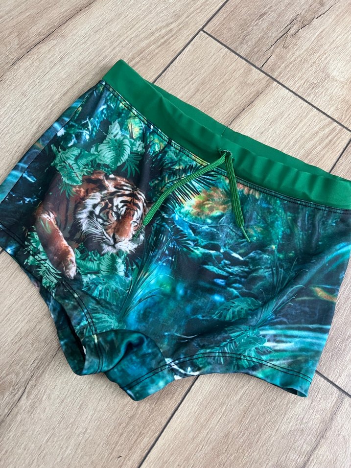 Renkli baskılı kaplan ve orman desenli, bel kısmı lastikli ve bağcıklı erkek çocuk yeşil mayo.