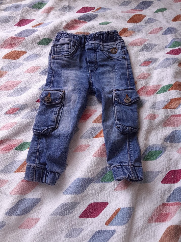 Erkek çocuklar için renkli batik desenli, bol kesim kot pantolon. Düğmeli cepleriyle sokak stiline uygun.