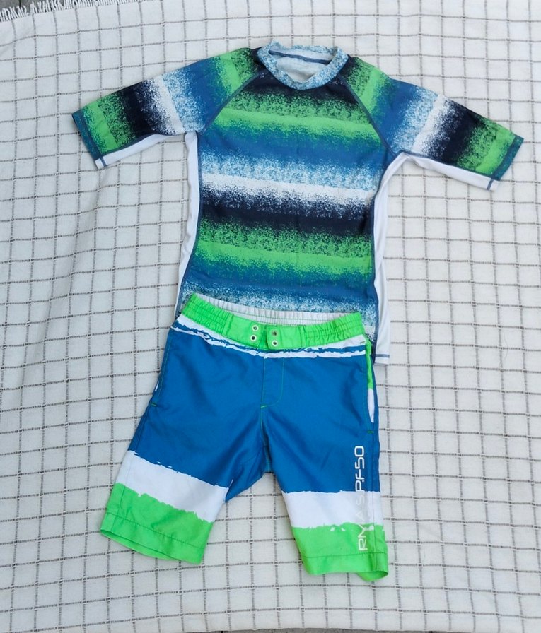 Erkek çocuk için kısa kollu, renkli batik desenli mayo ve yeşil-beyaz detaylı mavi şortlu mayo takımı.
