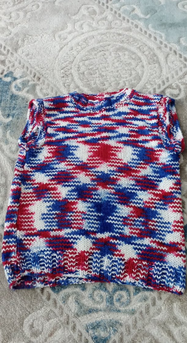 Renkli batik desenli, yumuşak triko kumaştan erkek çocuk süveter. Kolsuz, yuvarlak yakalı ve rahat bol kesimdir.