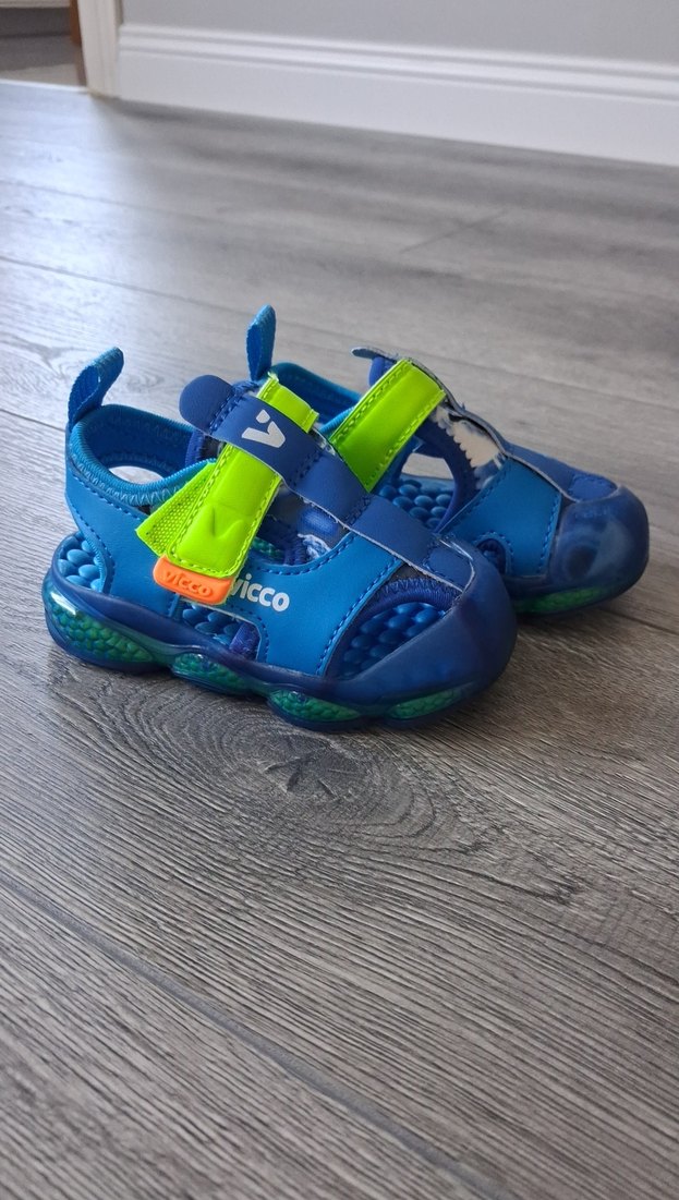 Renkli bağlama detaylı, mavi ve neon yeşil cırt cırtlı kauçuk erkek çocuk sandalet. Rahat ve şık sokak stili için uygundur.