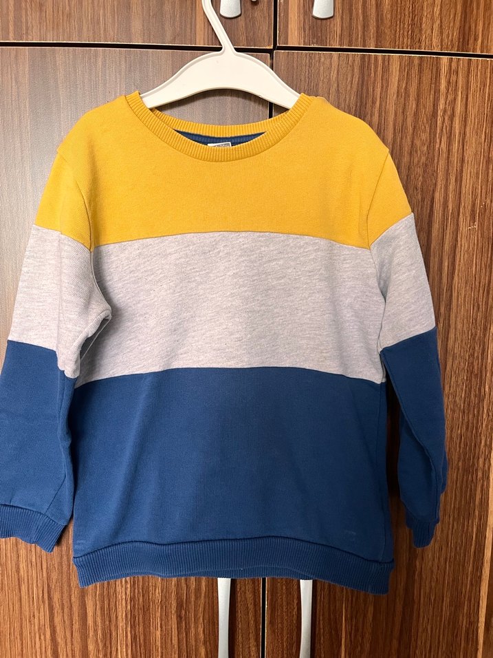 Erkek çocuk için sarı, gri ve mavi renklerde, çizgili desenli, yuvarlak yaka ve uzun kollu, bol kesim örme sweatshirt.