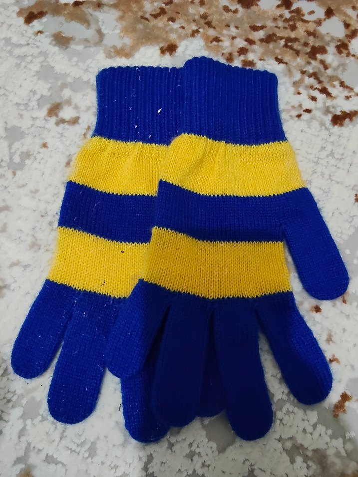 Erkek çocuklar için mavi ve sarı renkli çizgili triko eldivenler, yumuşak örme kumaştan üretilmiştir.
