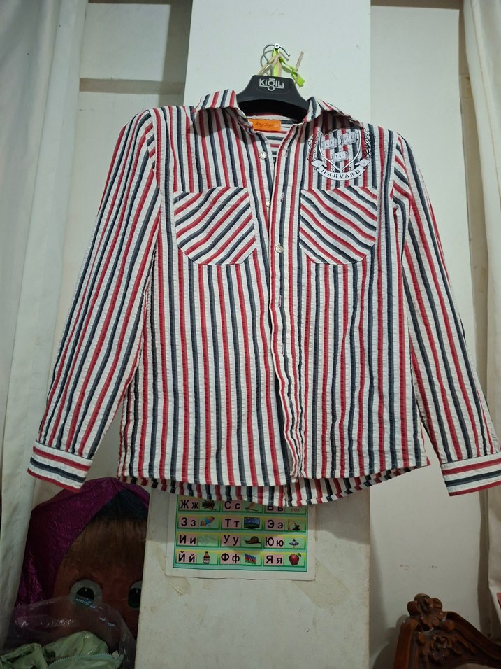 Uzun kollu, düğmeli ve yakalı erkek çocuk gömleği. Renkli çizgili desene ve iki göğüs cebine sahiptir. Rahat kesim, günlük sokak stili için uygundur.