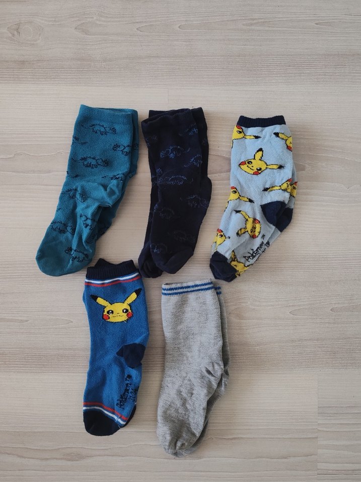 Erkek çocuklar için mavi ve gri tonlarında, Pikachu desenli ve düz modellerden oluşan rahat çorap seti. 31 34 Numara