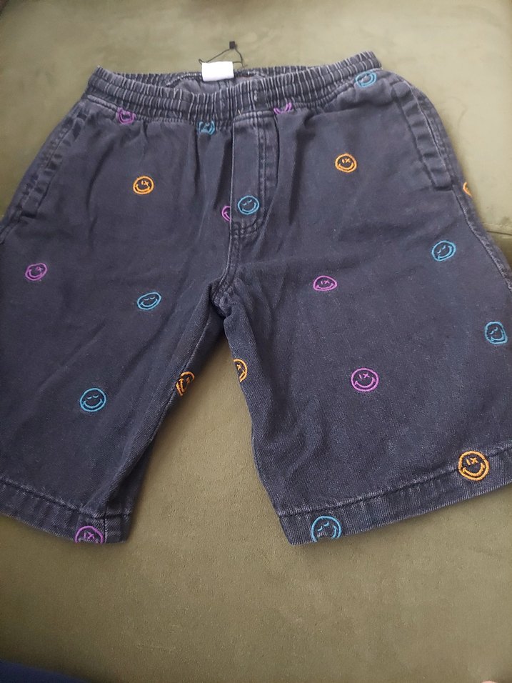 Erkek çocuklar için koyu renkli, bol kesim denim şort. Renkli gülen yüz emoji işlemeli desenleri ile trend bir tarz sunar. Temiz urundur