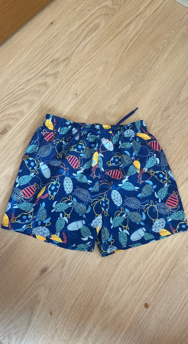 Mavi tabanlı, çeşitli desenlerle renkli bağlamalı erkek çocuk deniz şortu. Ayarlanabilir bağcıklı bel kısmı bulunur. 10-11 yaştır