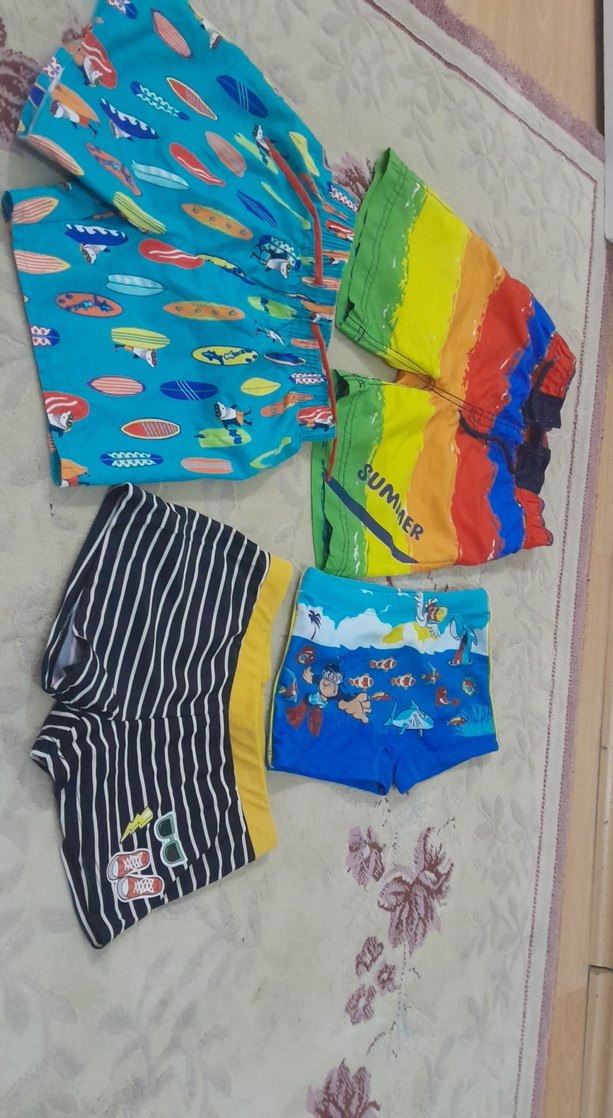 Renkli, kısa kollu erkek çocuk mayo ve şortları; çizgili, sörf tahtalı ve yaz temalı desenlerle dikkat çekiyor. ️