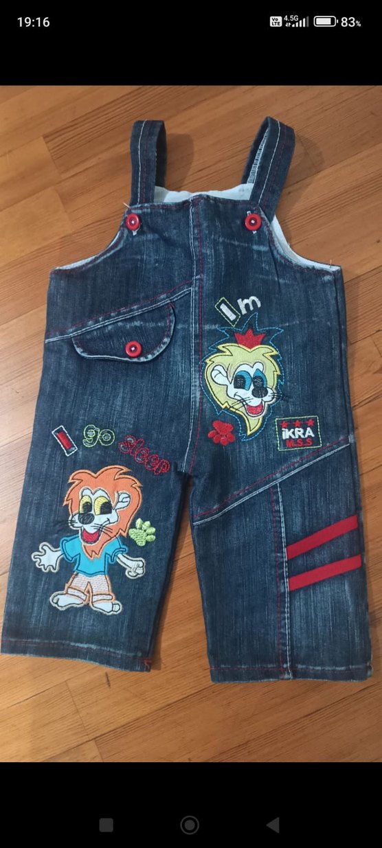 Renkli baskılı çizgi film desenli, düğmeli kot tulum. Erkek çocuklar için kolsuz ve rahat bol kesim. Üzerinde "iKRA" markası bulunur.