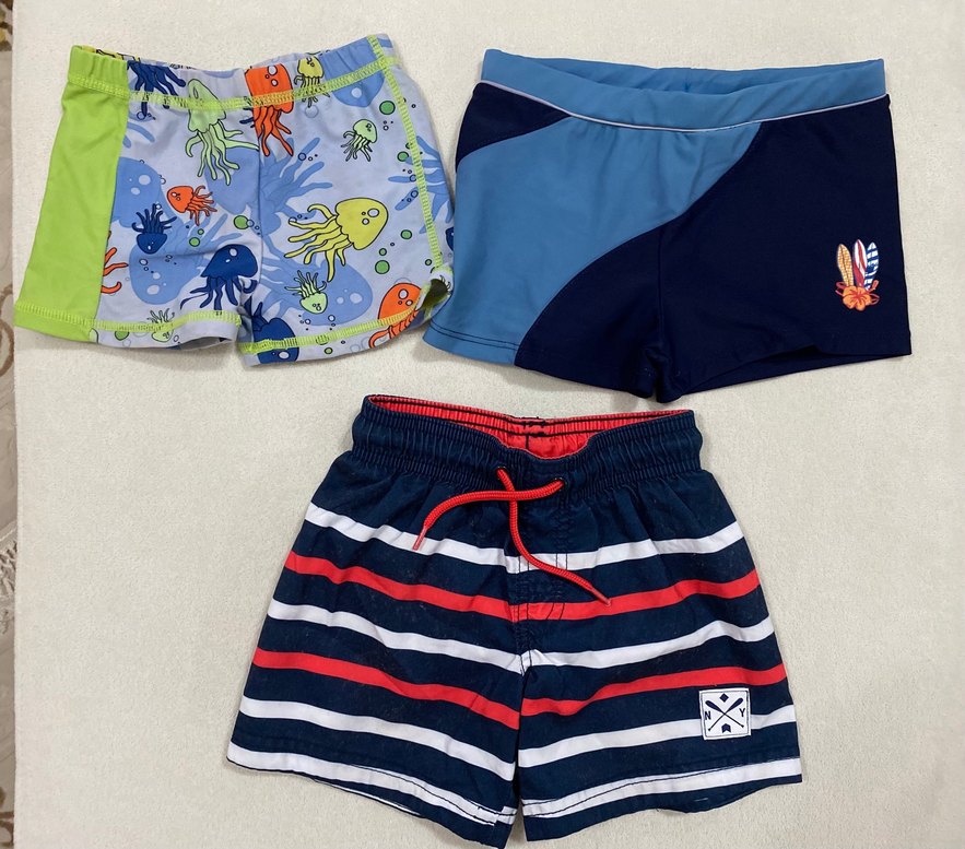 Erkek çocuklar için renkli, deniz canlıları, çizgili ve renk geçişli desenlere sahip mayo seti. Elastik bel bantlı, mavi ve lacivert tonları içerir.
