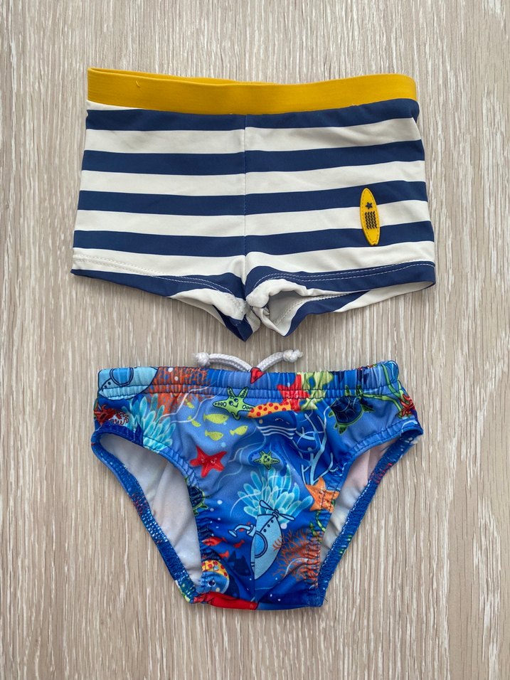 Erkek çocuk için renkli desenli iki parçalı mayo seti. Bir parça sarı bantlı çizgili, diğer parça su altı temalıdır.