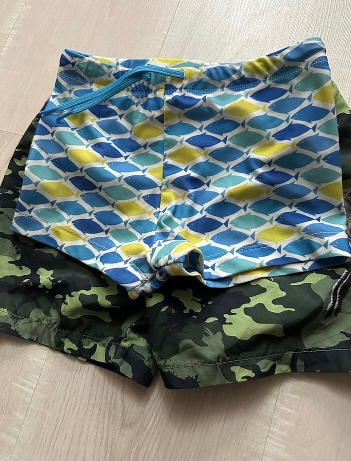 Erkek çocuklar için balık ve kamuflaj desenli, rahat kesim renkli mayo şort. Ikı adet