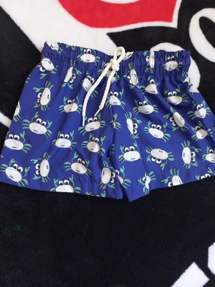 Mavi tabanlı, renkli ve oyuncu yengeç desenli erkek çocuk mayo şortu, konforlu ayarlanabilir bağcıklı bel ile.