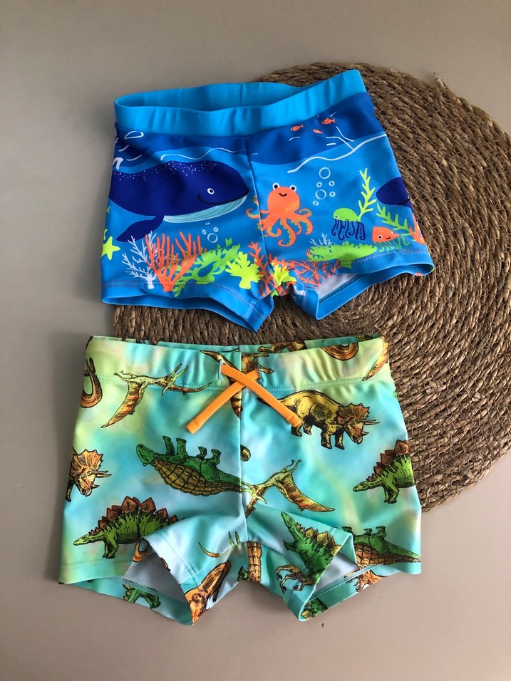 Renkli denizaltı ve dinozor desenli, hızlı kuruyan ve rahat kesime sahip erkek çocuk mayo şortları.