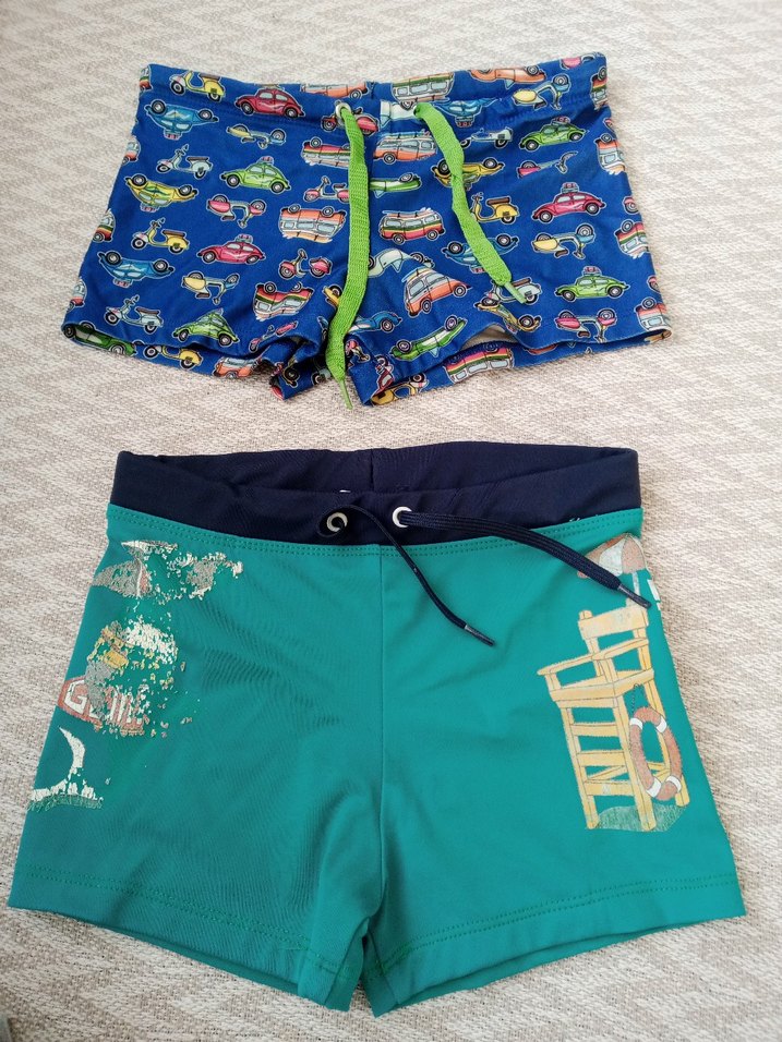 İki adet erkek çocuk mayo şortu: biri araç desenli ve neon yeşil bağcıklarla renkli, diğeri lacivert bel bantlı ve baskılı turkuaz şort.ikisinin fiyatidir