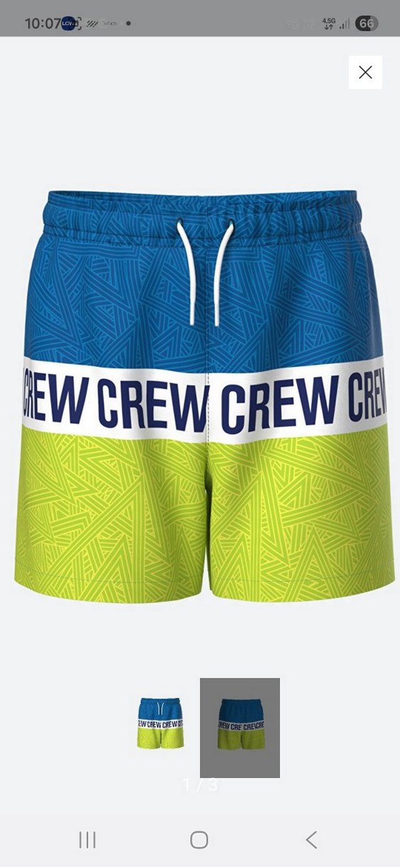 Canlı mavi ve yeşil desenli, bel kısmı lastikli ve bağcıklı erkek çocuk şortu. Orta kısımda "CREW" yazısı tekrarlanıyor.