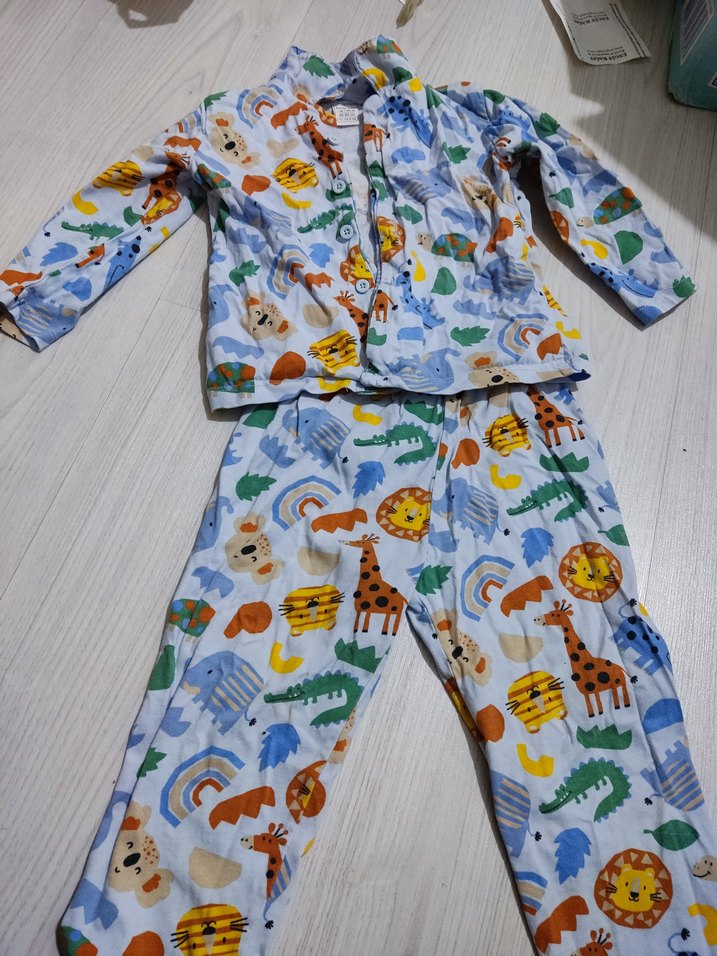 Renkli hayvan desenli, uzun kollu, yakalı ve düğmeli rahat kesim erkek çocuk pijama takımı.