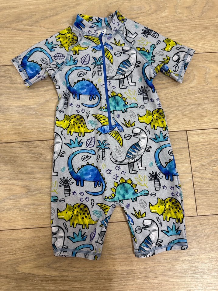 Kısa kollu, önü fermuarlı erkek çocuk mayo, gri zemin üzerinde renkli dinozor desenleri içerir. 3-4 yaş