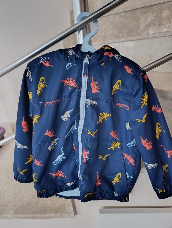 Renkli dinozor desenli, mavi renkli, fermuarlı ve geniş kesim erkek çocuk yağmurluğu. Yumuşak ve sıcak kumaştan üretilmiştir. ️