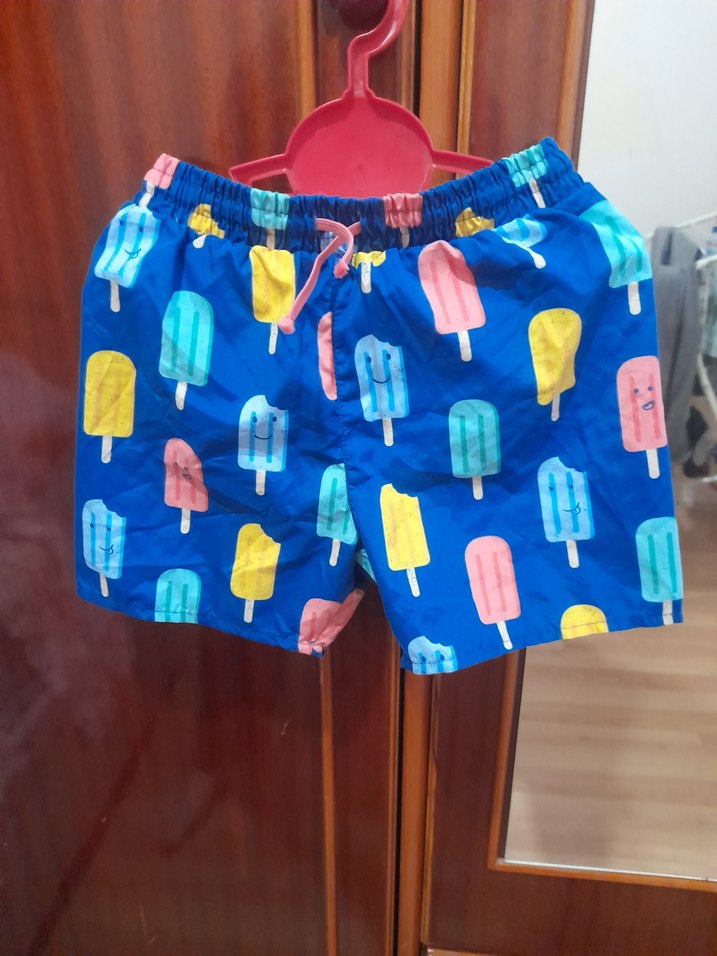 Mavi zemin üzerine renkli dondurma desenleri bulunan erkek çocuk mayo şortu. Elastik bel ve bağcık ile rahat kullanım sağlar.