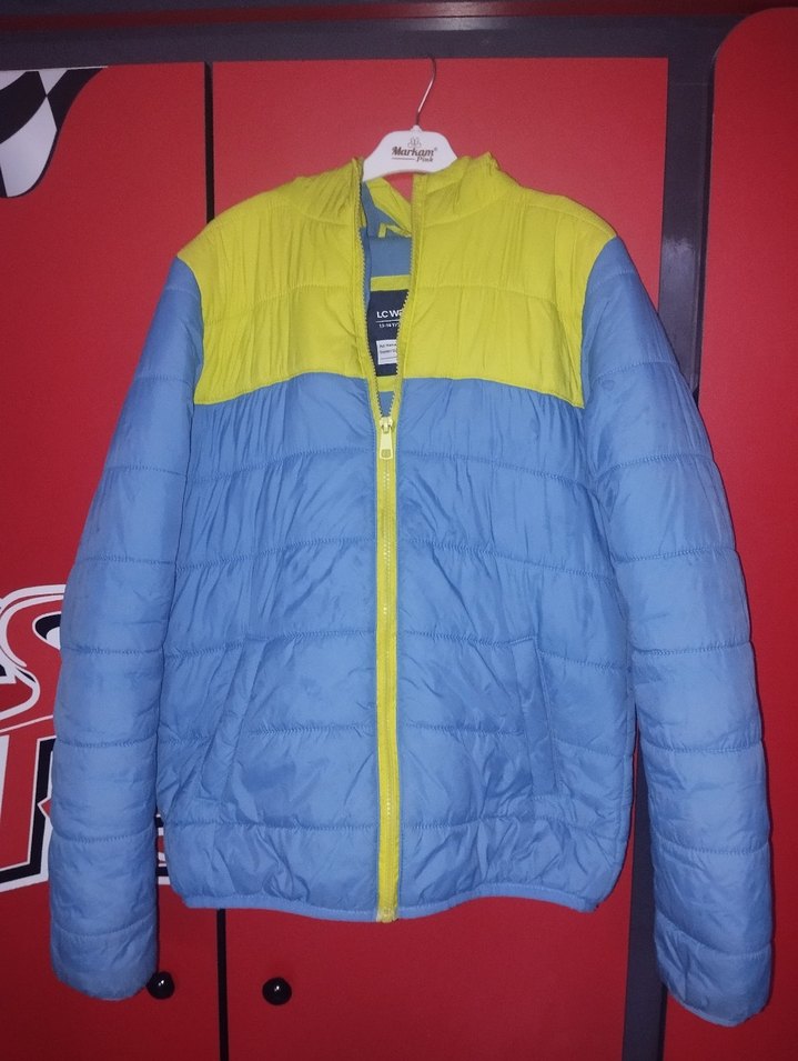Fermuarlı, bisiklet yaka ve renkli mavi-sarı tasarıma sahip, erkek çocuklar için fitted kesim mont.