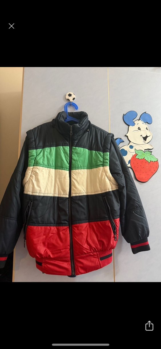 Fermuarlı cepleri ve boğazlı yakasıyla, yeşil, bej, siyah ve kırmızı renk bloklarından oluşan renkli ve dar kesim erkek çocuk montu.