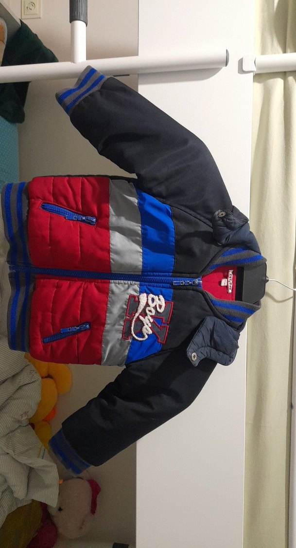 Erkek çocuklar için renkli, fermuarlı ceket,mont. Fermuar üzerinde fotoğrafta görüldüğü üzere hafif renk soyulması dışında herhangi bir sıkıntısı yoktur.