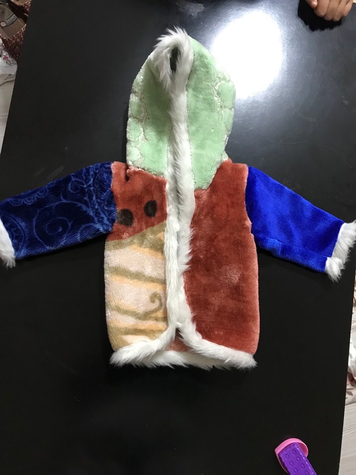 Erkek çocuk için kapüşonlu, renkli tie-dye desenli ve kürk detaylı, yumuşak ve sıcak kumaştan yapılmış, dar kesim mont. Özbekistan menşei hic kullanılmadı