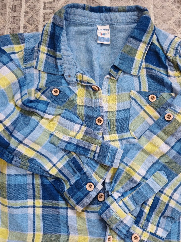 Erkek çocuk için renkli kareli, uzun kollu ve yakalı gömlek. Düğmeli ve bol kesimdir, yumuşak tekstil kumaştan üretilmiştir.
