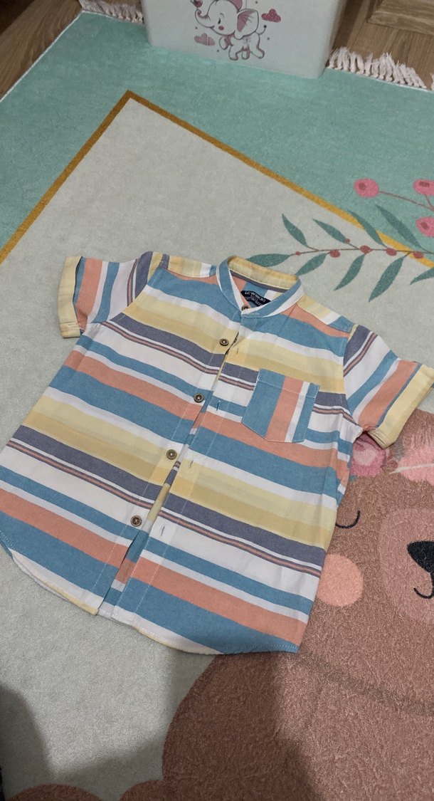 Erkek çocuklar için pamuklu, ince dokulu, renkli pastel çizgili, düğmeli, yakalı ve bol kesim kısa kollu gömlek.