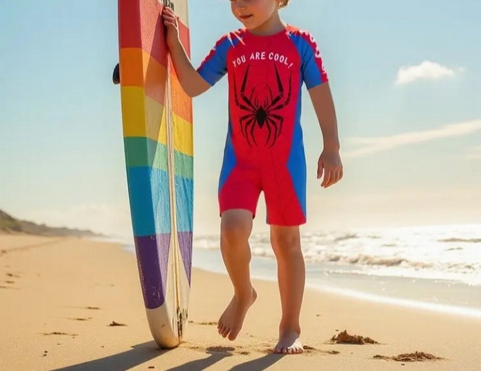 Renkli, kısa kollu erkek çocuk mayosu, canlı batik desenli ve 'You Are Cool' yazılı örümcek grafikli. ️#orumcekadam#spiderman#mayo#yaz#kum#gunes#plaj#sahil#tatil#eglence#kumsal#disney